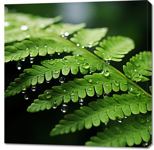 Obraz z serii natura zatytułowany Szepty Natury, prezentuje zbliżenie na liść paproci okryty kropelkami rosy, które lśnią jak drogocenne klejnoty na jego witalnie zielonej powierzchni. Delikatność każdej kropli wody, zawieszonej jakby na skraju czasu, oddaje spokój i harmonię natury, jednocześnie przywołując uczucie świeżości i ożywienia. Tło obrazu jest głębokie i jednolite, co pozwala zaakcentować jasne zieleń liści i przezroczystość wody. Ten obraz może być symbolem czystości i nowych początków, idealnie wkomponuje się w przestrzenie skoncentrowane na zdrowiu i dobrostanie, takie jak gabinety lekarskie, spa, czy też jako element dekoracyjny w łazienkach i pomieszczeniach relaksacyjnych, przynosząc uczucie spokoju i odświeżenia.