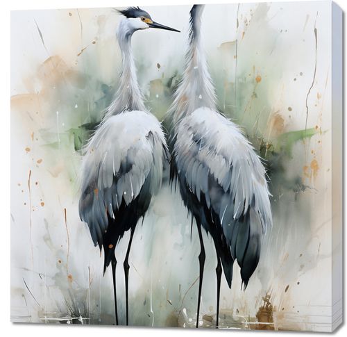 Obraz z serii natura zatytułowany Tańczące Czaple. Dwie czaple o wyrazistych profilach i smukłych szyjach stoją dumnie, ich pióra wydają się być delikatnie unoszone przez wiatr. Akwarelowe tło w odcieniach zieleni i szarości tworzy mglistą atmosferę, podczas gdy wybuchy kolorów w postaci kropli i plam dodają dziełu dynamiki i życia. Ich długie, smukłe nogi odbijają się w lustrzanej powierzchni wody, tworząc spokojny i jednocześnie ruchomy obraz. Ten malarski plakat idealnie pasuje do nowoczesnych salonów, gabinetów biologicznych oraz restauracji nad rzeką, gdzie harmonia łączy się z pięknem natury.