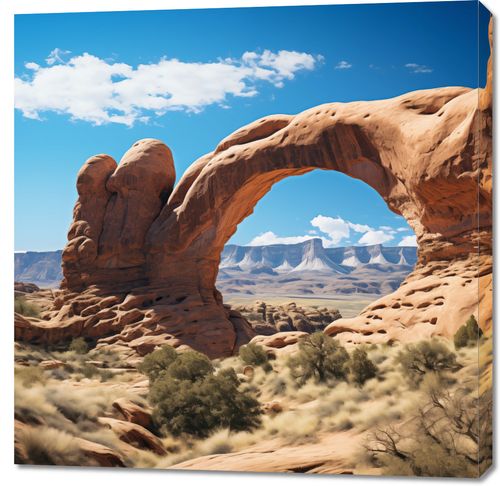 Obraz z serii pejzaże zatytułowany Triumf Natury. Zapierający dech w piersiach widok naturalnej formacji skalnej, która tworzy naturalny łuk, jest świadectwem niezwykłej siły i wytrwałości natury. Ciepłe odcienie pomarańczu i brązu skalnego łuku kontrastują z głębokim błękitem nieba, a delikatne zielone akcenty roślinności dodają życia i głębi kompozycji. Ta scena emanuje siłą i spokojem, stanowiąc doskonałe uzupełnienie dla przestrzeni takich jak współczesne biura, eleganckie pokoje dziennego wypoczynku, a także jako element dekoracyjny w hotelach i miejscach publicznych, gdzie natura spotyka się z designem.