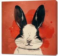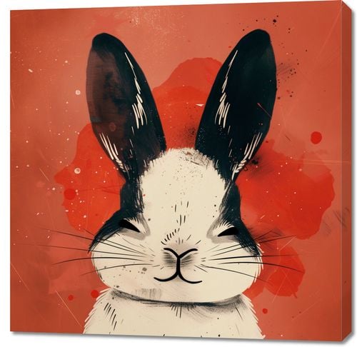 Obraz z serii abstrakcja zatytułowany Uśmiech! przedstawia wizerunek królika w stylistyce inspirowanej street art'em. Tło w ciepłej, czerwonej kolorystyce jest pokryte energicznymi plamami i rozpryskami farby, nadając dynamizmu całości kompozycji. Królik jest przedstawiony frontowo, z głową skierowaną prosto na widza. Jego uszy są wyraziste, czarne z białymi akcentami, co daje efekt trójwymiarowości. Urocza twarz zwierzęcia z subtelnym uśmiechem i charakterystycznymi wąsami wydaje się emanować spokojem i ciepłem. Detale takie jak tekstura futra królika są zaznaczone delikatnymi liniami i cieniowaniem, co dodaje realizmu i głębi grafice. Obraz ten sprawdziłby się jako dekoracja w przestrzeniach współczesnych, które cenią sobie oryginalność i lekkość wizualną, a jednocześnie wprowadza przytulny, domowy nastrój.