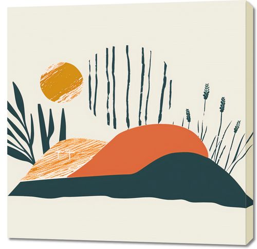 Obraz z serii boho zatytułowany Wieczór na Łące. Obraz ukazuje stylizowany krajobraz z elementami roślinności i słońcem na horyzoncie, wszystko przedstawione za pomocą geometrycznych kształtów i spokojnych barw. Łagodne linie wskazują na wzgórza i trawy, natomiast proste pociągnięcia przypominają wysokie źdźbła. Całość jest ujęta w stonowanej kolorystyce, która oddaje atmosferę końca dnia.Kompozycja jest idealna do wnętrz, w których chce się wprowadzić elementy natury w subtelny, artystyczny sposób. Będzie pasować do salonów w stylu boho, przytulnych kawiarni, a także jako element wzbogacający estetykę prostych, nowoczesnych biur. Zapewnia wizualny odpoczynek i może stanowić inspirację do chwil refleksji i spokoju.