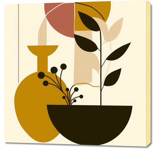 Obraz z serii minimalistyczne zatytułowany Wielkość Natury. Zaprezentowana jest tutaj elegancka kompozycja roślin w prostym naczyniu, zestawiona z geometrycznymi blokami kolorów w ciepłej, naturalnej palecie. Przywodzi ona na myśl harmonię i zorganizowaną prostotę, które można znaleźć w naturze, jak również w ludzkich tworach. Elementy w kształcie koła i półkola nadają kompozycji spokoju i równowagi, a linie i bloki kolorów tworzą poczucie głębi i struktury. Ten obraz będzie idealny do wnętrz, gdzie ceni się porządek i minimalistyczne podejście do dekoracji, wnosząc jednocześnie elementy natury i spokoju. Idealny do umieszczenia w przestrzeniach takich jak nowoczesne salony, eleganckie gabinety, lub jako spokojne tło w przestrzeniach biurowych.