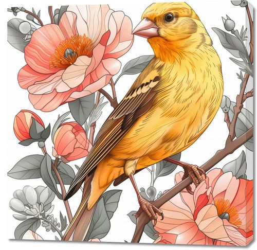 Obraz z serii natura zatytułowany Wiosenny Śpiewaczek przedstawia pełną detali i życia scenę, w której jaskrawo żółty ptak, przypominający kanarka, spoczywa na gałęzi wśród kwitnących kwiatów. Delikatne i subtelne kolory kwiatów w pastelowych odcieniach różu i pomarańczu tworzą miękki kontrast do żywego upierzenia ptaka. Precyzyjne linie i staranne cieniowanie nadają ilustracji realistycznego wyglądu, a roślinność w tle jest równie szczegółowo wykonana, co dodaje kompozycji głębi i bogactwa. Ten obraz to celebracja wiosennego odrodzenia i piękna natury, idealny do ożywienia każdego wnętrza, szczególnie pokoju dziennego, przestrzeni odpoczynkowej lub kawiarni o przytulnej atmosferze.