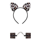Opaska została wykonana z trwałego materiału o ciekawej fakturze, ozdobiona brązowymi i czarnymi akcentami przyciągającymi wzrok. Kocie uszy umieszczone na koronce podkreślają oryginalny charakter produktu. Kajdanki wyposażone są w regulowany, złoty łańcuszek, ktory umożliwia dopasowanie do indywidualnych potrzeb – gwarantuje wygodę noszenia i bezpieczne użytkowanie.