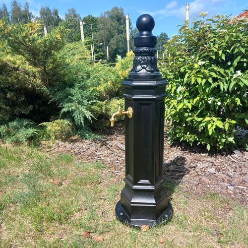 W zestawie kran mosiężny z ozdobną rozetą, do którego można podłączyć wąż ogrodowy.
