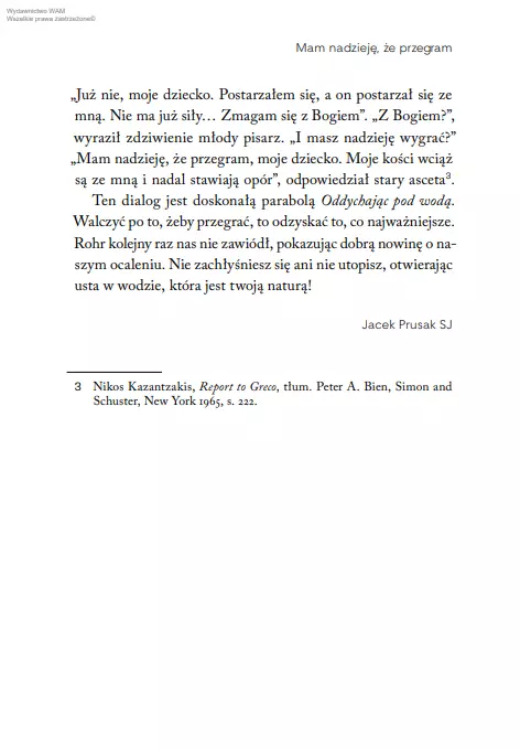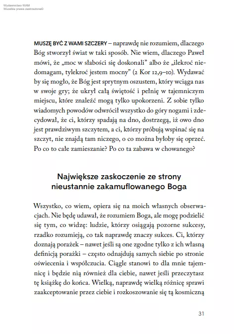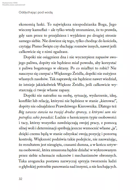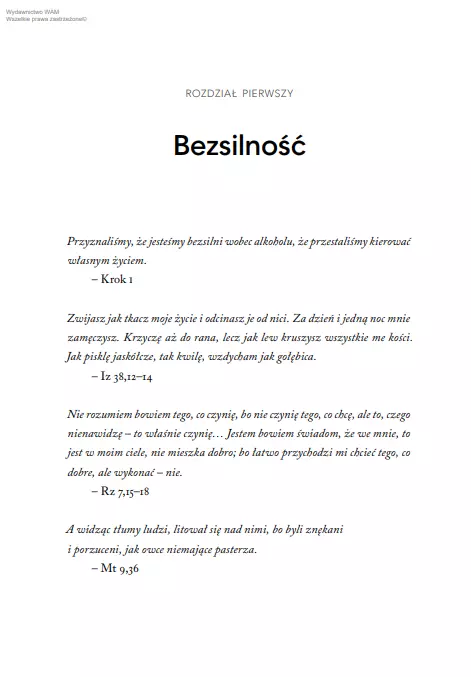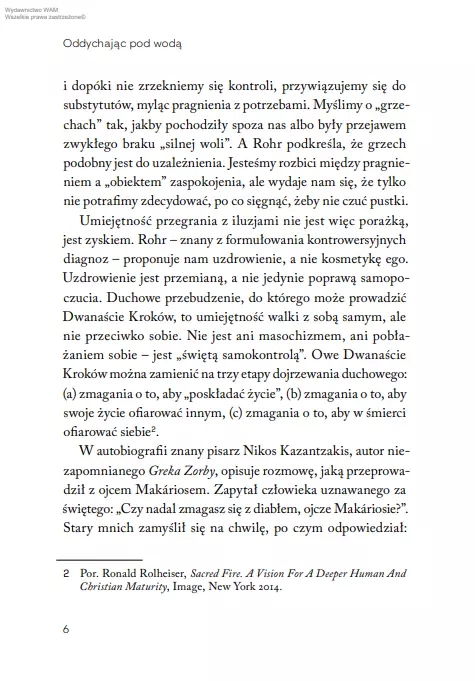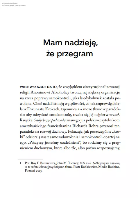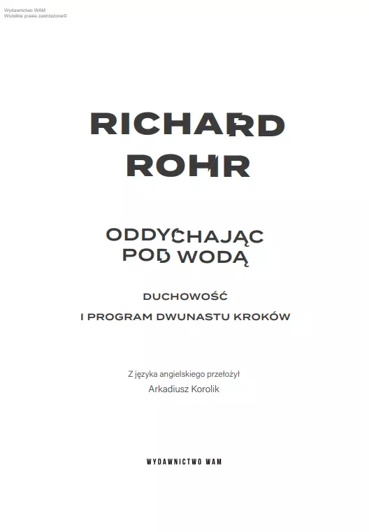 Co mają ze sobą wspólnego przesłanie Chrystusa i Program Dwunastu Kroków? Czy grzech jest rodzajem uzależnienia? Co to znaczy„oddychać pod wodą”? Po raz kolejny Richard Rohr towarzyszy nam w fascynującej podróży w głąb siebie samych. By ją odbyć, trzeba zrobić tylko i aż tytułowych „dwanaście kroków”, które prowadzą do duchowego przebudzenia. Podążając drogą paradoksów, na której poddajemy się, aby zwyciężyć, umieramy, aby żyć, i oddajemy, aby zatrzymać, stopniowo zbliżamy się do wolności i szczęścia. Rohr zachęca nas, żebyśmy zweryfikowali swoje dotychczasowe życiowe pewniki i przyjrzeli się motywacjom, które nami kierują. Chce, byśmy z odwagą spojrzeli na siebie w świetle prawdy. Przypomina, że Chrystus kocha nas nie dlatego, że się zmieniamy – kocha nas, byśmy mogli się zmienić; chce nas uzdrowić i tchnąć w nas oddech nowego życia.