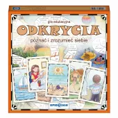 „Odkrycia. Poznać i zrozumieć” siebie to ekscytująca gra planszowa dla dzieci i dorosłych w każdym wieku Gra pomoże zrozumieć siebie, poznać swoje zachowania, reakcje na konkretne sytuacje życiowe. Pozwoli nam odkryć w sobie empatię, poprawi komunikację interpersonalną, rozwinie umiejętność uważnego słuchania, jak i świadomego komunikowania międzyludzkiego oraz z samym sobą. Jest narzędziem terapeutycznym dla terapeutów, nauczycieli i rodziców. Została stworzona przez doświadczonego terapeutę, aby pomóc dzieciom i dorosłym wyrażać swoje myśli i uczucia. Dzieciom bardzo często trudno jest opowiedzieć o sobie, o tym, co je trapi. W dorosłym wieku objawia się to problematyczną formą podejścia do życia. Oprócz głównych pytań występujących na kolorowej planszy, gra Odkrycia. Poznać i zrozumieć siebie zawiera 30 kart przedstawiających różne scenki z życia wzięte, 4 karty pytań, służące uczestnikom gry do zadawania dodatkowych pytań. Stosowanie kart jest szczególnie skuteczne, jeśli chodzi o pomoc dzieciom w radzeniu sobie z najrozmaitszymi problemami. Karty ułatwiają otwarcie się w rozmowie, a następnie dzielenie się osobistymi przeżyciami oraz uczą rozwijania swoich wypowiedzi. „Odkrycia. Poznać i zrozumieć siebie” to gra pomocna zarówno w pracy indywidualnej, jak i grupowej, w środowisku terapeutycznym oraz szkolnym. Gra jest także doskonałym narzędziem dla rodziców, którzy doświadczają trudności komunikacyjnych w relacji ze swoimi dziećmi oraz dla tych, którzy chcieliby lepiej poznać swoje dzieci i dla wszystkich bez wyjątku, którzy chcieliby lepiej poznać samych siebie. W komplecie znajduje się książeczka, a w niej instrukcja, jak delikatnie i z wyczuciem zadawać skuteczne pytania. Grający, zgodnie z instrukcją, wykonuje zadania z każdego pola, na które trafi jego pionek. Niektóre pola zawierają konkretne pytanie do niego, podczas gdy na innych polach bierze się kartę z ilustracją i opowiada własną interpretację obrazka. Przez cały czas pozostali gracze mogą korzystać ze specjalnych kart – pytania, dzięki którym mogą zadawać graczowi od 1 do 3 pytań na temat jego historii życia. Każdy, kto stanie pionkiem na pole życzeń, wypowiada 3 życzenia. A kto pierwszy dotrze do zamku, wygrywa. W skład gry wchodzą: • kolorowa plansza do gry, • 30 kart ilustrowanych, • 4 karty do zadawania pytań, • 2 karty do indywidualnej historii, • 4 drewniane pionki – kolorowe zwierzątka, • drewniana kostka do gry, • książeczka z instrukcją gry.