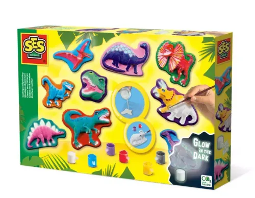 Zestawy do formowania i malowania firmy SES Creative gwarantują kreatywny dzień pełen zabawy! Z tym zestawem stworzysz kolorowe, świecące w ciemności dinozaury. Plastikowe formy są wykonane z tworzywa sztucznego pochodzącego z recyklingu i łatwe do wypełnienia gipsem. Po utwardzeniu gipsu dzieci mogą przystąpić do pracy z pędzelkiem i sześcioma kolorami farby by wykonać własne, niepowtarzalne gipsowe figurki.