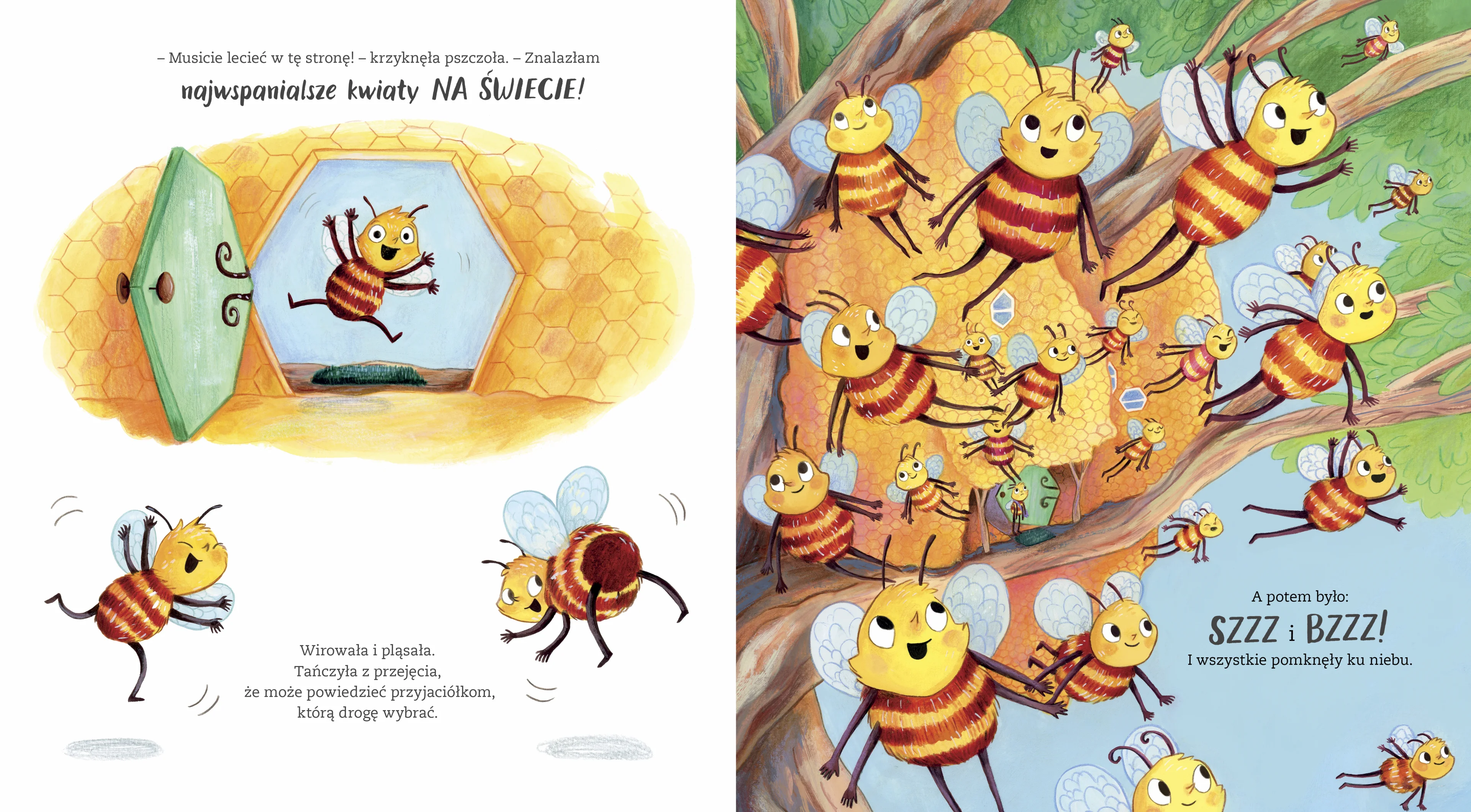 OLŚNIEWAJCA, ZABAWNA, UROCZA KSIŻKA KONTYNUUJE TEMAT ?ODWAGI, ZAJCZKU? ? POKONYWANIA LĘKU PRZED NIEZNANYM. URZEKA BAJECZN KOLOROWOŚCI OBRAZÓW NATURY I WZRUSZAJC PRAWDZIWOŚCI POSTACI, KTÓRE STAN SIĘ PRZYJACIÓŁMI KAŻDEGO DZIECKA. Mała pszczółka Isia boi się latać? Chciałaby fruwać wśród kwiatów, ale obawia się, że nie potrafi. Co będzie, jeśli jej skrzydełka są za słabe? A co, jeśli się zgubi? A co, jeśli spadnie? Kiedy wszystkie pszczoły wylatują, Isia... idzie na piechotę. Ale po drodze jest tyle przeszkód i nie można dostać się do kwiatów. Już chce wracać, aż nagle słyszy jakieś dziwne dźwięki... Czy to nieoczekiwane spotkanie pomoże małej pszczółce przezwyciężyć obawy i przekonać się, jaka jest dzielna? Recenzje polskich czytelników: ?Nowa książka Nicoli Kinnear to przepiękna opowieść o obawie i jej przezwyciężaniu. Po raz kolejny książka od Wydawnictwa Amberek skradła serca moich dzieci. Opowieść o niepewności, lęku i przezwyciężaniu tego, co wydawało się paraliżujące, dotyka dziecięcego świata niemal codziennie, dlatego pięknie jest dawać dziecku narzędzia, którymi może sobie pomóc. Ta książka sprawdza się w tej ciężkiej pracy doskonale?. @bargielita_ ?Autorka bestsellera ODWAGI, ZAJCZKU ponownie wzięła na warsztat brak pewności siebie, by dodać odwagi w pokonywaniu własnych lęków i słabości. (?) To kolejna Amberkowa nowość, która przełamuje dziecięce lęki i obawy. Pomaga wzmocnić poczucie wartości dziecka, ale też dodać odwagi w chwili zwątpienia. Książka stanowi też wspaniały pretekst do rozmów o uważności, empatii i życzliwości :) Piękne wydanie, urzeka feerią kolorów. Bardzo polecam!? @zaczytany_franek ?Ta dowcipna, inspirująca historia jest pełna pięknych ilustracji i idealnie nadaje się do czytania na głos. Przepiękne, kolorowe obrazki: dzieci pokochają odkrywanie tego wykwintnego świata małych stworzeń. Wspaniale ilustrowane książki Nicoli Kinnear są pełne fantastycznych postaci i cudownych przesłań o dzieleniu się, przyjaźni, odwadze i życzliwości?. @readingmylove NICOLA KINNEAR olśniła w 2019 roku swym talentem w debiucie ?Odwagi, zajączku?, który stał się jedną z najpopularniejszych i najpiękniejszych książek dla dzieci ostatnich lat. Jej wyjątkowa wrażliwość i talent do tworzenia uroczych postaci oraz malarskich, bajecznie kolorowych obrazów natury zachwyciły również w następnych książkach: ?Ciii? Cichutko!? ? o przełamywaniu nieśmiałości, ?Zmień prawa smoków, Rubinko!? ? o umiejętności dzielenia się, ?Pobaw się ze mną? ? o pokonywaniu oporów przed kontaktami z innymi i o przyjaźni mimo różnic, ?Pomożemy ci, wiewiórko? ? o samodzielności i przełamywaniu strachu lub wstydu przed korzystaniem z życzliwej pomocy. Najnowsza książka Nicoli Kinnear ? ?Odwagi, pszczółko?, która światową premierę miała w Amberku ? kontynuuje przesłanie ?Odwagi, zajączku? o pokonywaniu lęku przed nieznanym. Książki Nicoli Kinnear dają dzieciom radość i poczucie bezpieczeństwa.
