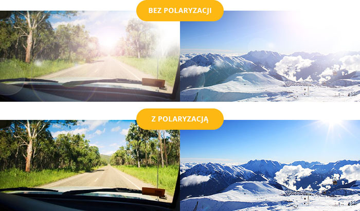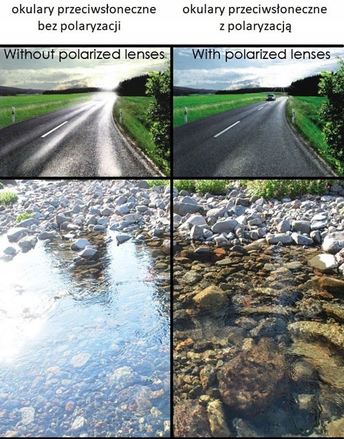 Okulary przeciwsłoneczne chronią oczy przed promieniowaniem UVA i UVB, ale nie redukują odblasków. Filtr polaryzacyjny blokuje światło odbijające się od powierzchni i znacznie poprawia pole widzenia.