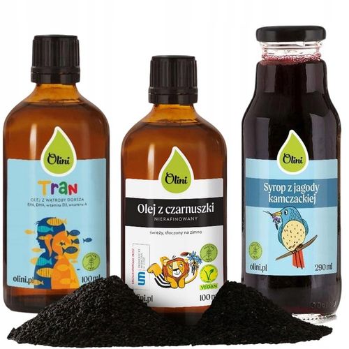 Ten wysokiej jakości zestaw od Olini łączy w sobie unikalne właściwości trzech produktów: oleju z czarnuszki, tranu oraz syropu z jagody kamczackiej. Tworzy on kompleksowe rozwiązanie dla wzmocnienia odporności i prawidłowego rozwoju Twojego dziecka w sposób całkowicie naturalny i bezpieczny.