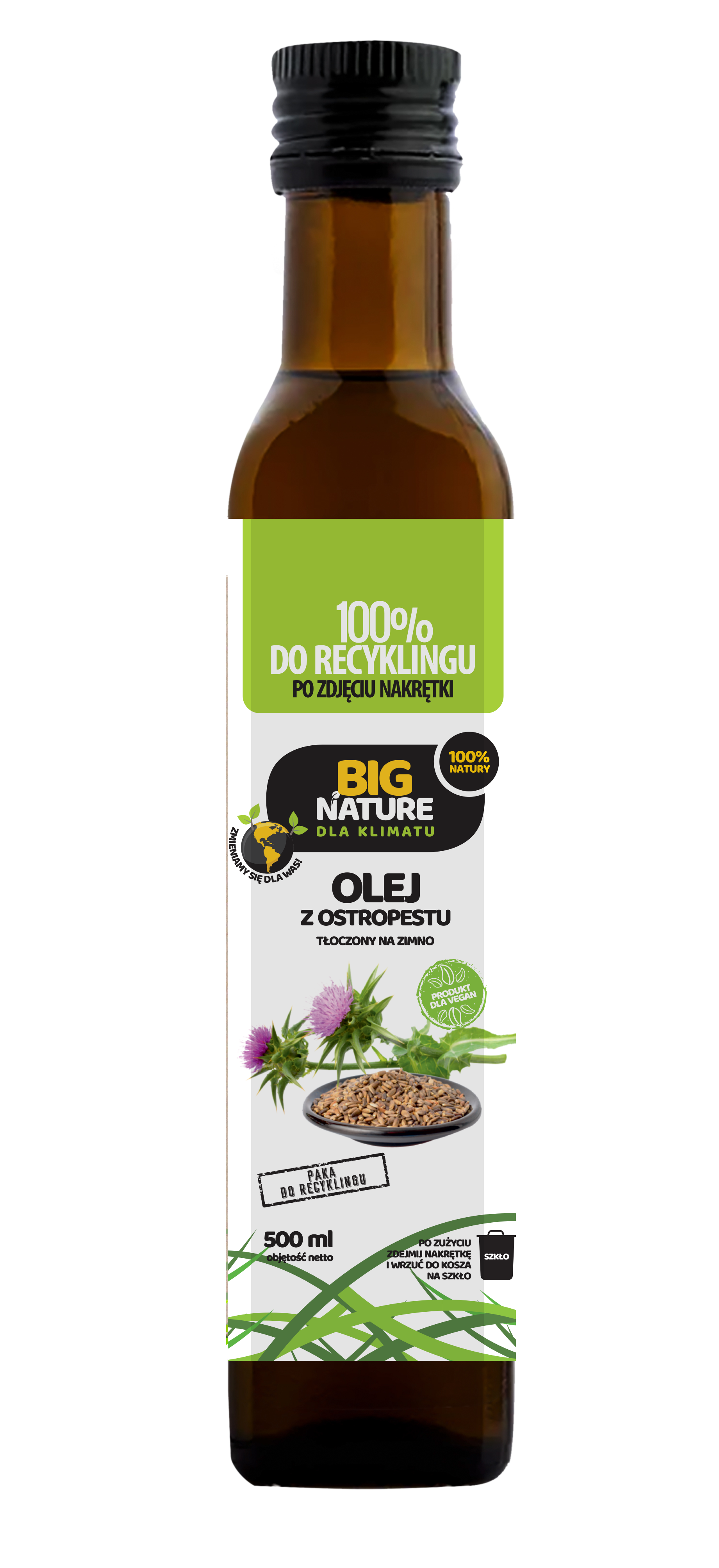 Opis: Opakowanie zawiera 500ml oleju z ostropestu tłoczonego na zimno.