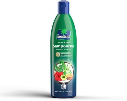 Olejek do włosów Sampoorna Parachute to wyjątkowe połączenie oleju z kokosa oraz pięciu specjalnych ziół: hibiskusa, methi, liści curry, amla i aloesu, znanych ze swoich udowodnionych korzyści dla włosów. Innowacyjna formuła tego produktu wnika głęboko w włosy i sklap, dostarczając niezbędnego odżywienia od nasady, aż po końce, co sprawia, że Twoje włosy stają się gęste i długie. Hibiskus nadaje włosom miękkości, methi wzmacnia je i sprawia, że stają się dłuższe, a aloes nawilża i wspomaga ich wzrost. Liście curry z kolei zachowują naturalny kolor włosów, natomiast amla pomaga w kontrolowaniu łupieżu. Bez względu na to, czy masz proste, kręcone, cienkie, gęste, czy delikatne włosy - ten olejek do włosów jest odpowiedni dla wszystkich.