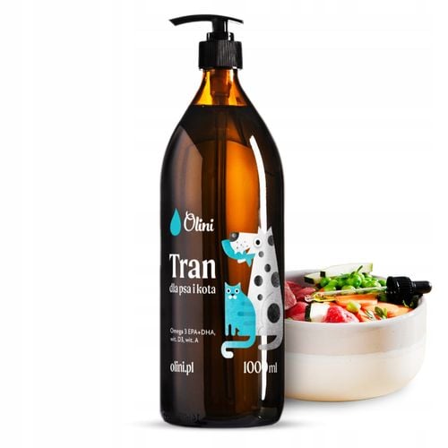 Olini Tran dla psa i kota o pojemności 1 litra to kompleksowe rozwiązanie wspierające zdrowie Twojego pupila na co dzień. Naturalny olej z wątroby dorsza Atlantyckiego, pozyskiwany zgodnie z rygorystycznymi standardami zrównoważonego połowu, gwarantuje wysoką jakość i czystość produktu, wolnego od metali ciężkich, dioksyn oraz pestycydów. Dzięki starannej rafinacji, olej zachowuje bogactwo kwasów tłuszczowych omega-3 (EPA i DHA), które odgrywają kluczową rolę w prawidłowym funkcjonowaniu organizmu.