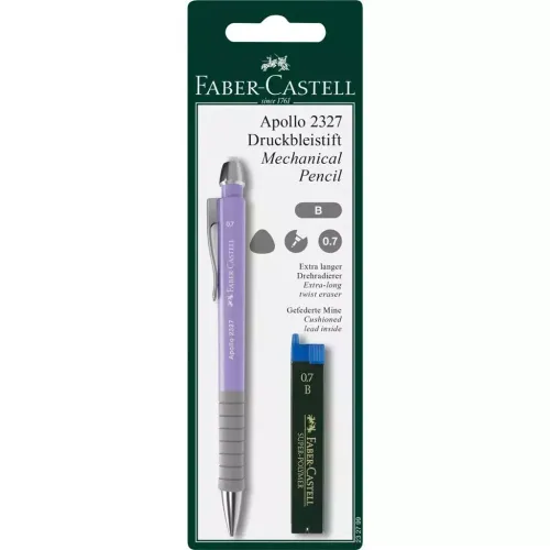 Ołówek automatyczny Apollo Faber-Castell 1 szt. z wkładami w opakowaniu blistrowym. Nowoczesny ołówek do pisania i szkicowania. Wysoce ergonomiczny, dzięki antypoślizgowej, gumowej strefie uchwytu. Wyposażony w technologię amortyzującą grafit dla ochrony przed łamaniem. Chowana osłona grafitu. Ze zintegrowaną gumką i metalowym klipsem. Średnica grafitu: 0,7 mm.