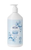 On Line Cotton dream delikatny płyn do kąpieli & żel pod prysznic 2w1 wzbogacony gliceryną, witaminą E, mleczkiem bawełnianym, ekstraktem z jaśminu oraz emolientem pochodzącym z masła murumuru.