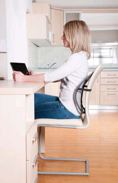 Ergonomiczne oparcie zostało zaprojektowane tak, że pasuje do większości krzeseł i foteli, również tych samochodowych, dzięki czemu można z niej korzystać również podczas podróży samochodem.