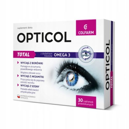 Opticol Total to wysokiej jakości suplement diety, który skutecznie pomaga w utrzymaniu prawidłowego widzenia. Zawiera starannie wyselekcjonowane składniki, takie jak wyciąg z borówki, cynk i ryboflawina, które wspierają zdrowie oczu i poprawiają ostrość wzroku.
