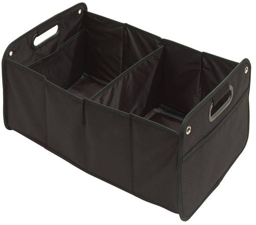 Organizer do bagażnika CAR-GADGET, składany, 2 przegródki z matami na spód, 1 siatkowa kieszonka, 2 uchwyty do przenoszenia, z rzepem od spodu dla lepszej przyczepności do podłoża bagażnika i 4 metalowymi oczkami do dodatkowego przymocowania – dzięki elastycznemu paskowi można złożyć, aby zaoszczędzić miejsce, gdy nie jest używany.