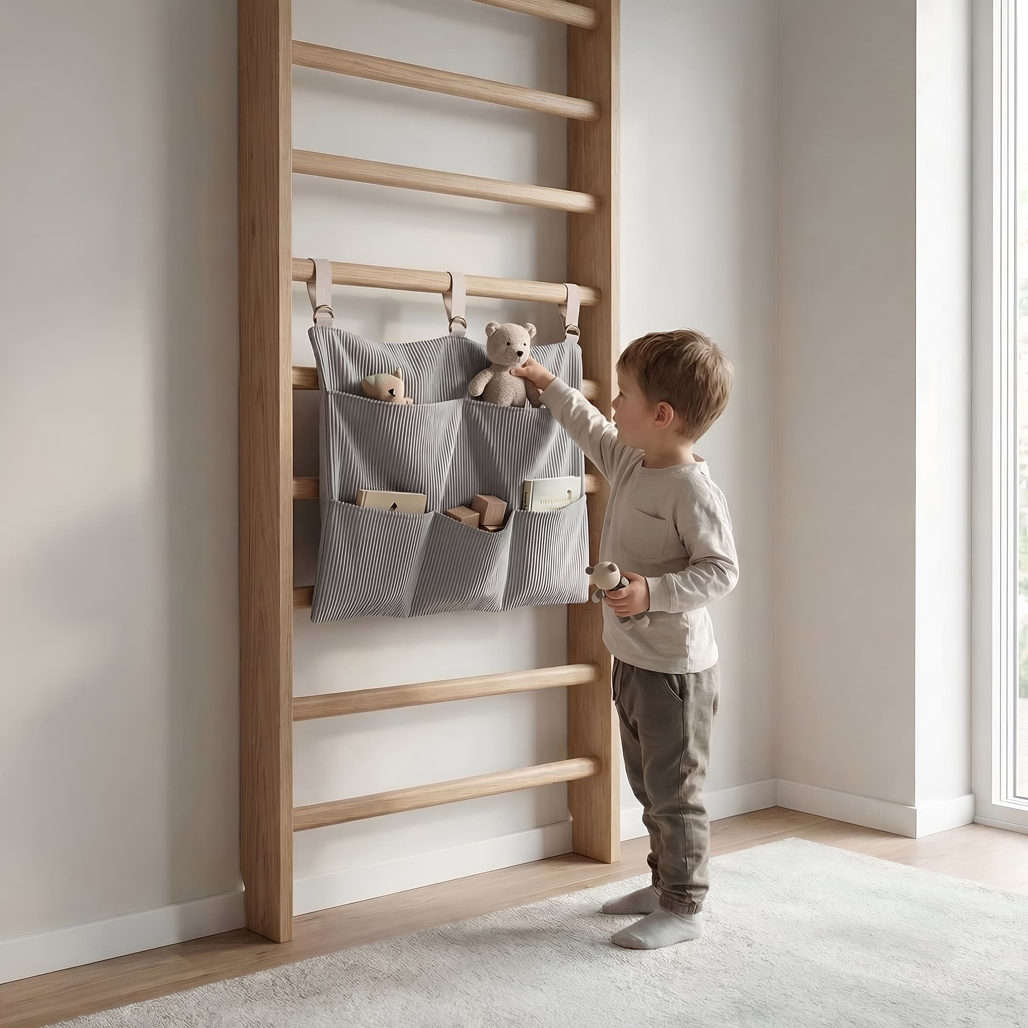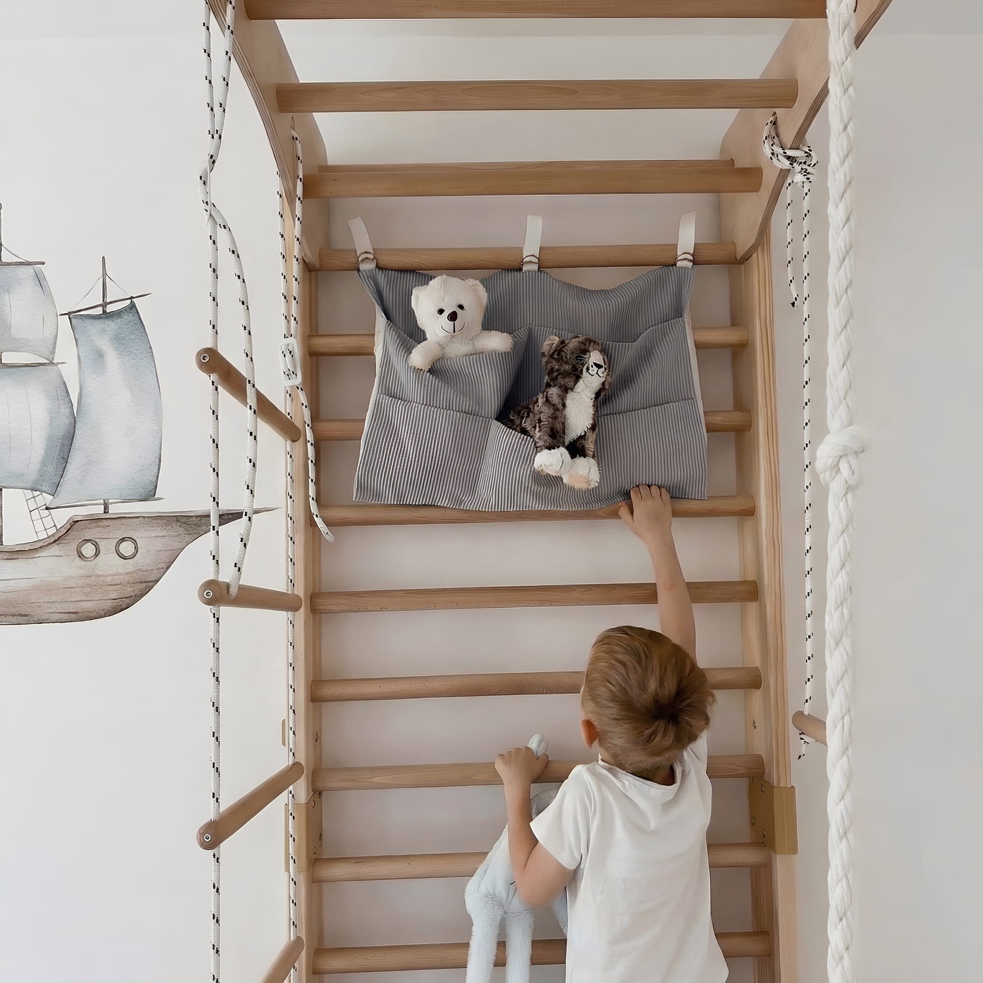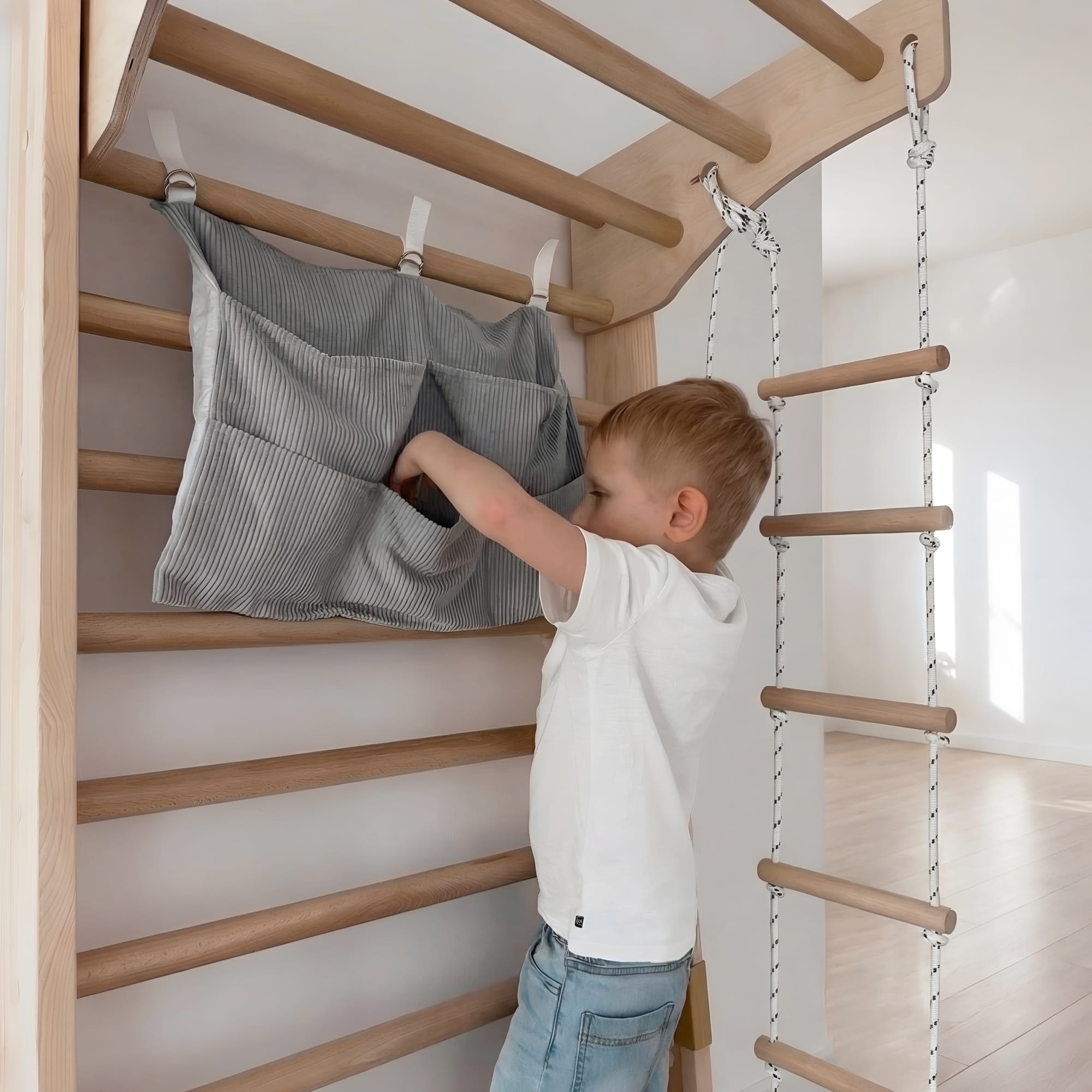 Organizer do drabinki w kolorze szarym to praktyczne akcesorium, które pomaga utrzymać porządek w pokoju dziecka. Jego największą zaletą jest łatwy montaż na drabince gimnastycznej oraz wygodny dostęp do ulubionych zabawek, książek i akcesoriów.