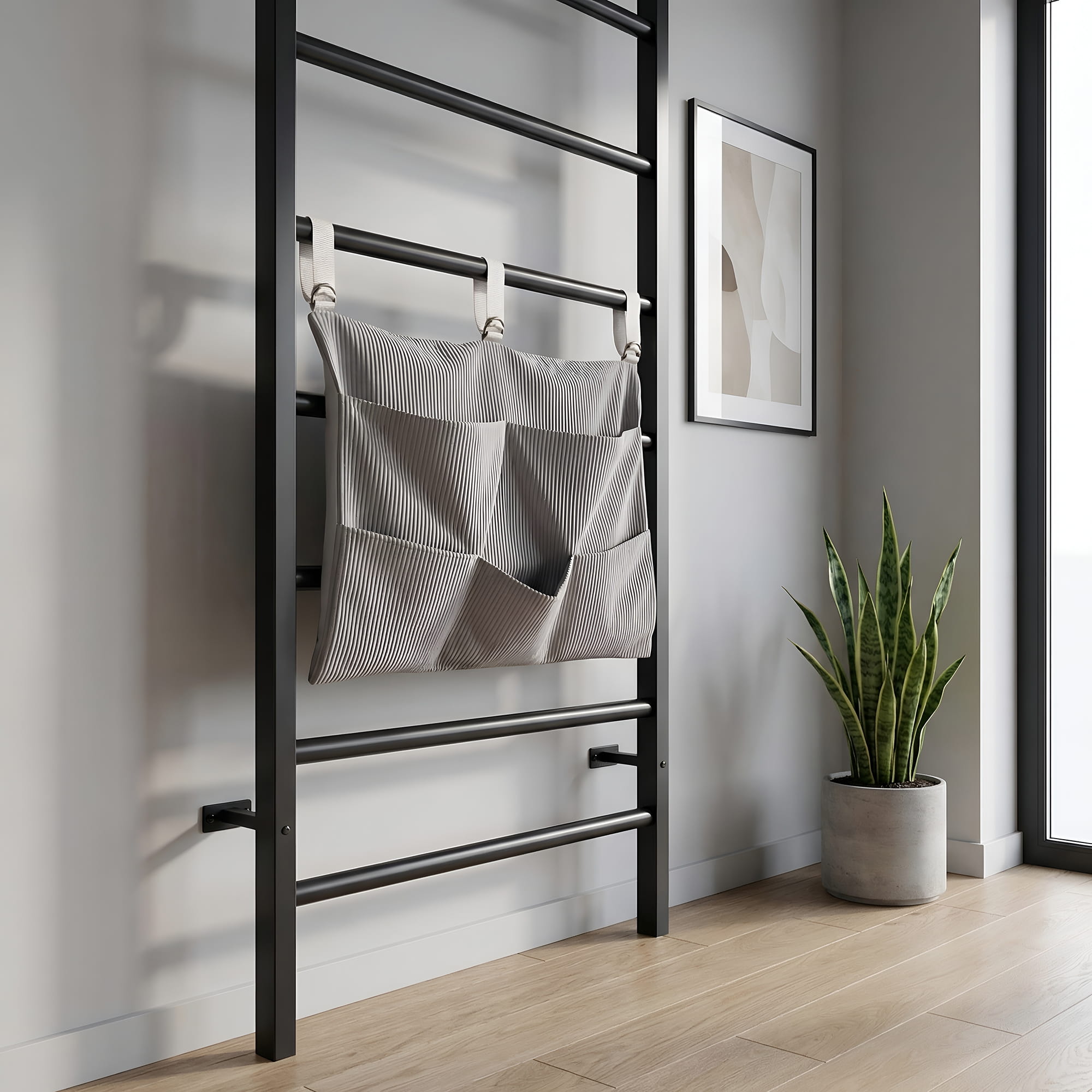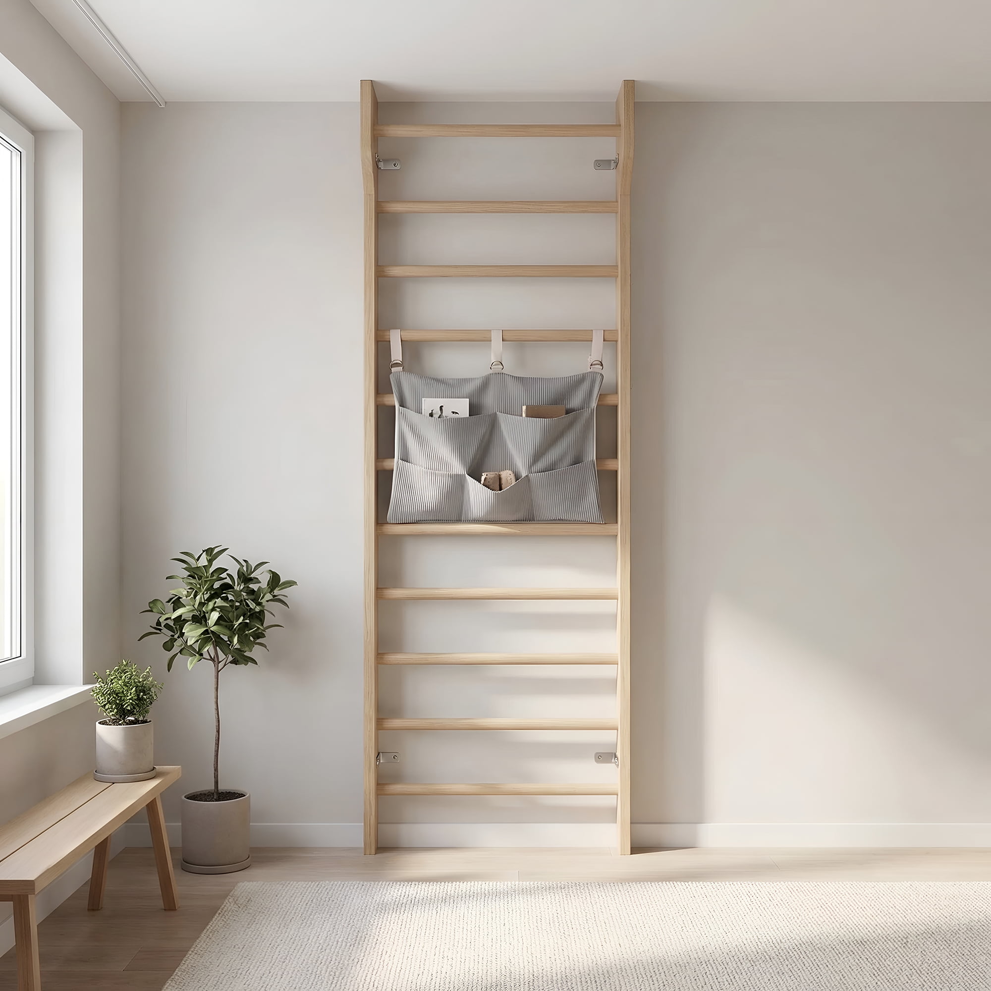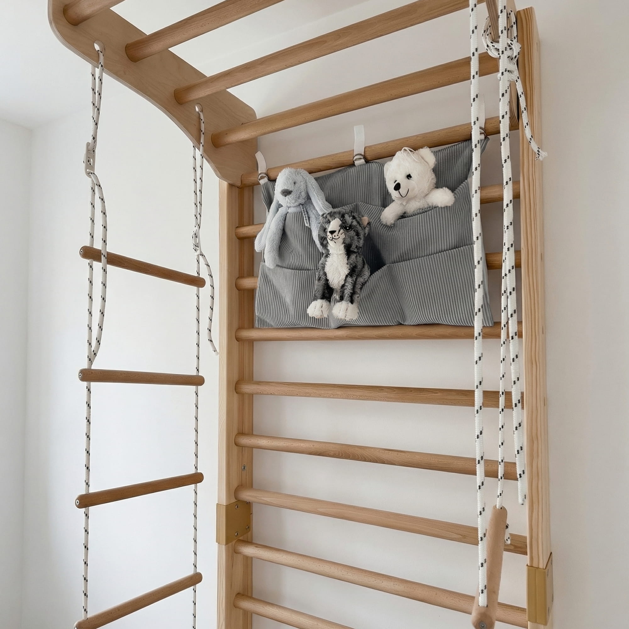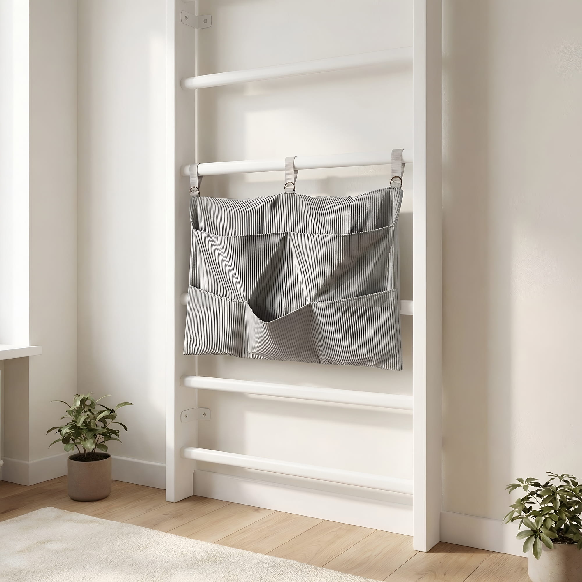 Organizer do drabinki w kolorze szarym to praktyczne akcesorium, które pomaga utrzymać porządek w pokoju dziecka. Jego największą zaletą jest łatwy montaż na drabince gimnastycznej oraz wygodny dostęp do ulubionych zabawek, książek i akcesoriów.