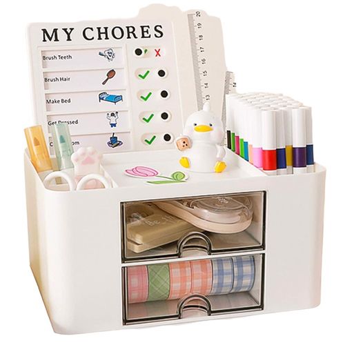 Wielofunkcyjny organizer na biurko z 4 przegródkami na artykuły papiernicze i 2 szufladami.