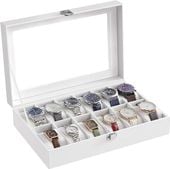Klasyczne pudełko do przechowywania zegarków z 12 przegródkami, poduszkami do zegarków, które można wyjąć w celu przechowywania biżuterii, oraz szklana pokrywa, która chroni zegarki przed kurzem