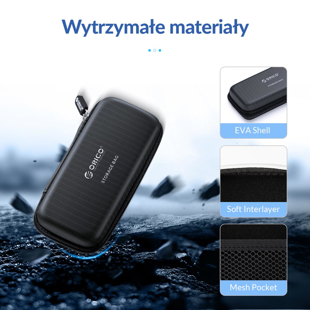 Odporne na kurz i wilgoć etui ochronne typu „skorupa” pozwoli Ci na przechowywanie małego dysku zewnętrznego M.2 nawet w ekstremalnych warunkach. Etui zawiera praktyczną kieszeń z siatki, w której możesz umieścić kable, słuchawki czy inne drobne akcesoria. Przestrzeń na dysk twardy jest zabezpieczona gumą, która dodatkowo amortyzuje wstrząsy.