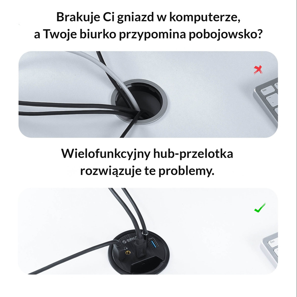 Stwórz ergonomiczne stanowisko pracy lub gry razem z 4-portowym hubem od Orico! Urządzenie zostało zaprojektowane specjalnie do przelotek na kable w biurkach, więc nie zajmuje miejsca na blacie. Okrągły kształt idealnie wpasowuje się w otwory o średnicy 6 cm. Hub do biurka, podobnie jak standardowy przepust kablowy, umożliwia przeciągnięcie kabli od monitora czy innych peryferii.