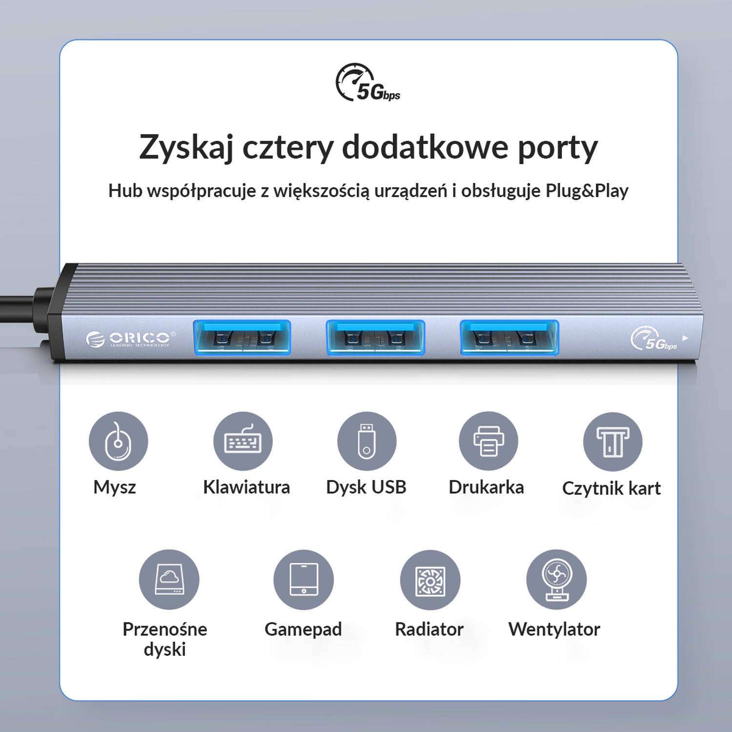 Rozszerz swoje możliwości dzięki hubowi od Orico! Ten niewielki gadżet pozwoli na podłączenie poprzez port USB-C czterech urządzeń z portem USB-A. Takie rozwiązanie doskonale sprawdzi się wówczas, kiedy Twój laptop ma mało portów, a chcesz podłączyć do niego np. nanoodbiorniki od ulubionej myszy czy klawiatury.