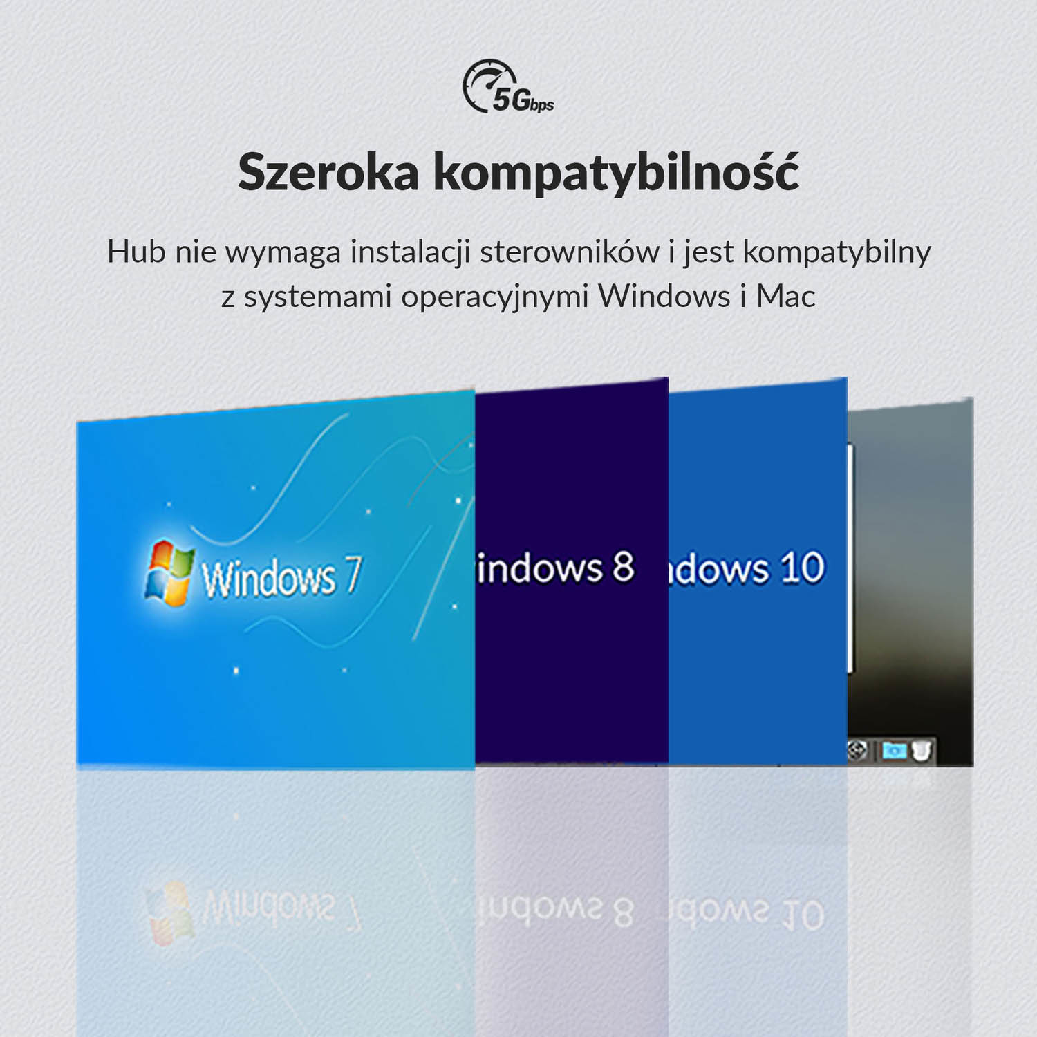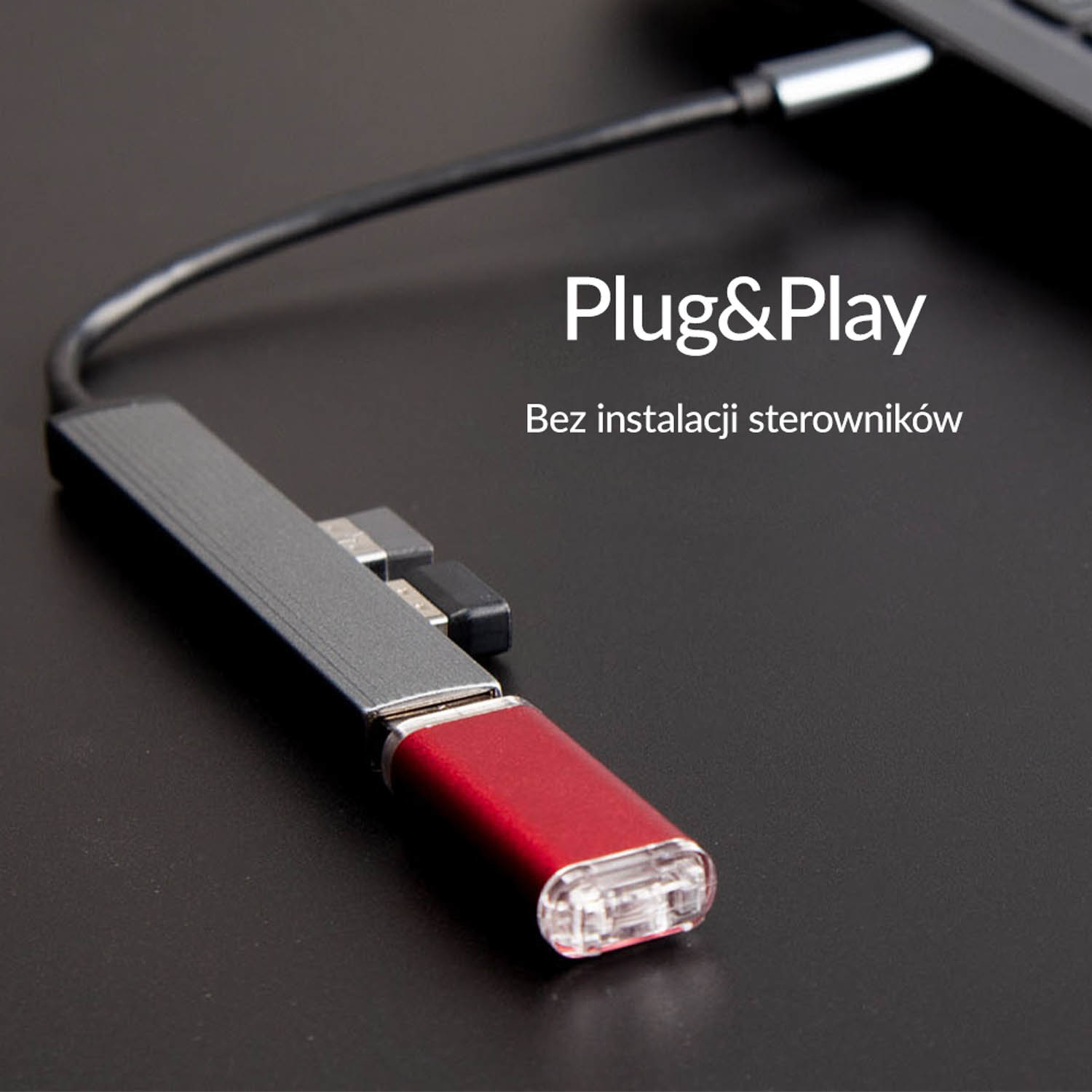 Hub jest bardzo prosty w obsłudze. Wystarczy, że podłączysz go do włączonego urządzenia. Nie wymaga instalacji sterowników i współpracuje z systemami operacyjnymi Windows, Mac i Linux. Komfortowe korzystanie z huba zapewnia giętki, wbudowany przewód o długości 15 cm zakończony wtykiem USB-C.