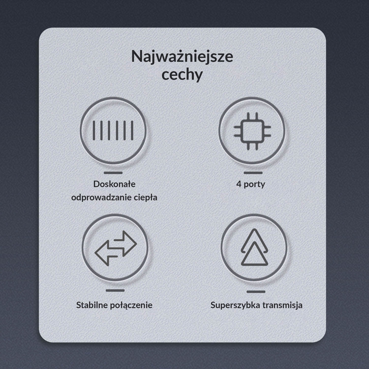 Prążkowana, aluminiowa obudowa nie tylko doskonale się prezentuje. Gwarantuje również odprowadzanie ciepła, dzięki czemu masz pewność, że połączenie jest bezpieczne dla Twoich urządzeń. Hub ma niewielkie wymiary (8,8 cm długości, 1,5 cm szerokości i 7,5 mm wysokości), przez co możesz go bez problemu spakować do torby lub plecaka. Zajmie niewiele miejsca na Twoim biurku, a przez elegancki wygląd wpasuje się w każdą przestrzeń.