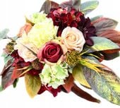 ✔️Bogata kompozycja z chryzantemami, hortensjami, różami i dalią, wzbogacona jesiennymi liśćmi, paprociami i pnączami dla naturalnego, wielowymiarowego efektu.
