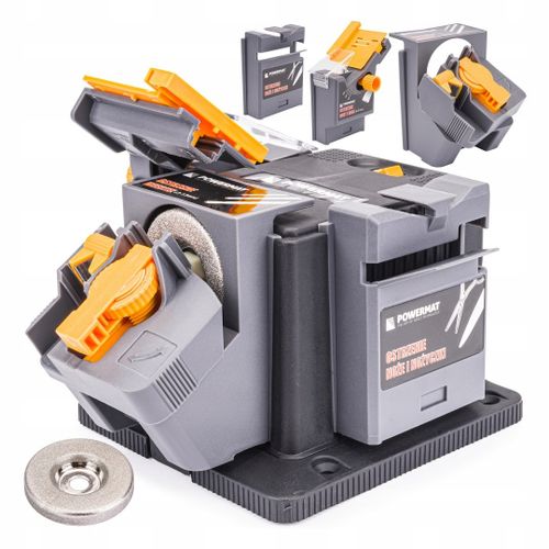 Ostrzałka wyposażona jest w tarczę pokrytą pyłem diamentowym. Tarcze diamentowe są bardziej wytrzymałe oraz mniej zużywają się niż klasyczne kamienie stosowane w ostrzałkach. W zestawie dołączone są trzy przystawki do ostrzenia: Wierteł HSS, Noży i Nożyczek, Dłut i Hebli.