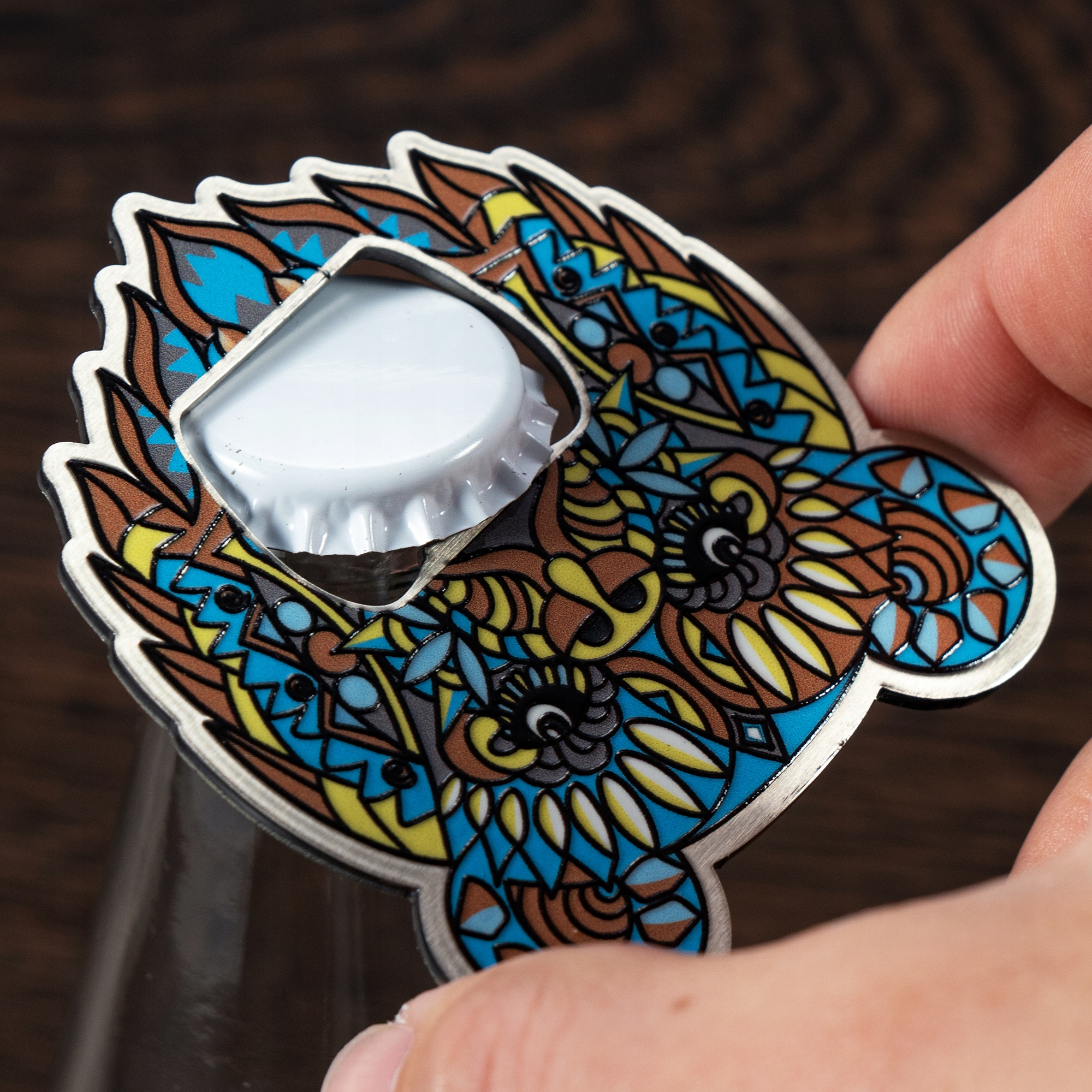 ,A jeśli już sięgniesz po ten estetyczny emblemat, to wiesz co robić. Butelki pełne orzeźwiających napojów i kolorowych alkoholi czekają, by je otworzyć. Nasz otwieracz sprawdzi się w tym doskonale – pozbędzie się kapsla w 2 sekundy! Przyjemny w dotyku przedmiot (nadruk przestrzenny robi swoje), pozwoli Ci poczuć na dłoniach każdy jego szczegół. Przekonasz się, z ilu detali może się składać lwia grzywa czy sowie pióra!