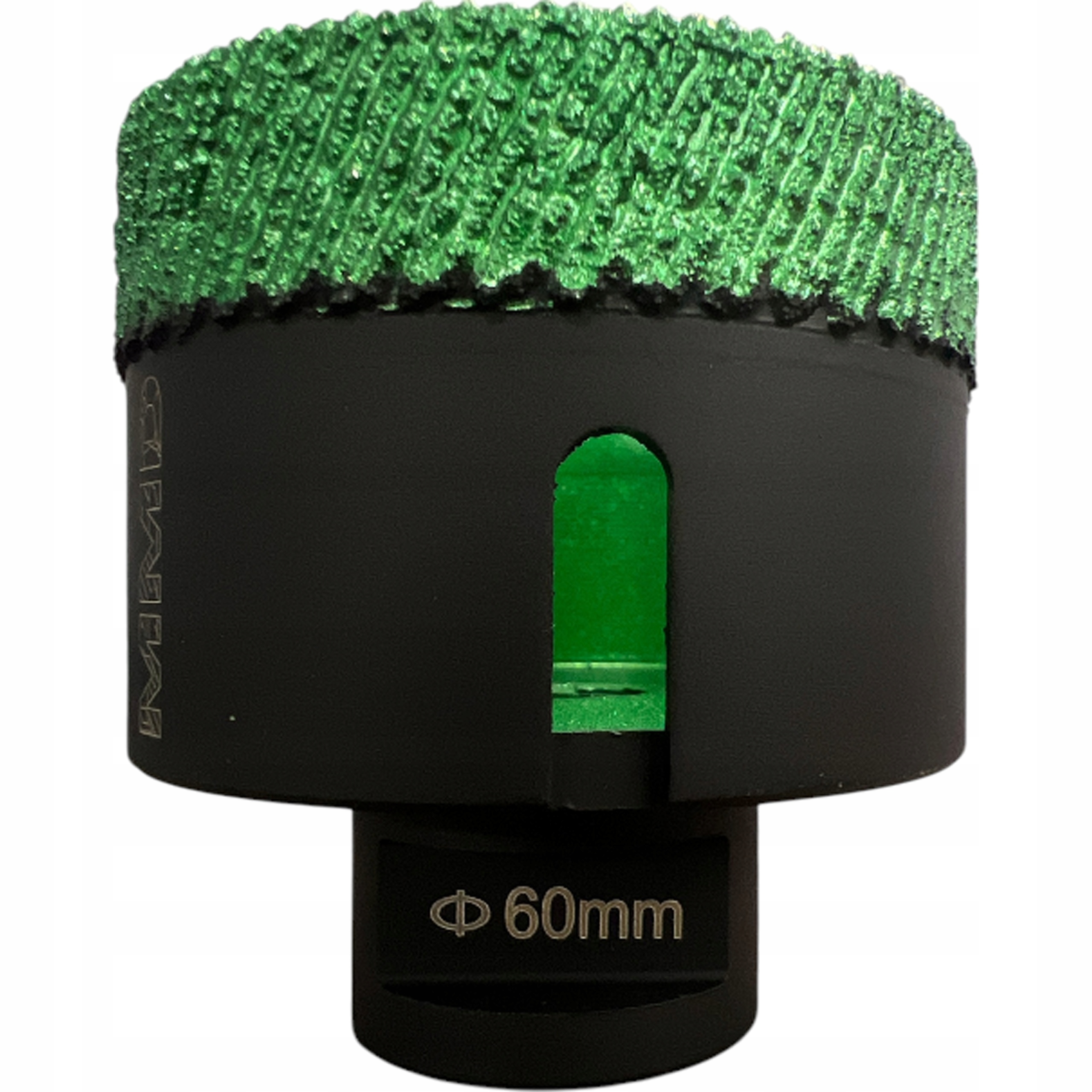 Otwornica diamentowa MMD Ø60 mm z gwintem M14 to specjalistyczne narzędzie do wykonywania dużych otworów w najtwardszych materiałach wykończeniowych: gresie, ceramice, marmurze, granicie, płytkach i kamieniu naturalnym. Technologia vacuum brazed (lutowanie próżniowe) zapewnia maksymalną trwałość, odporność na zużycie i precyzyjne cięcie – także bez stosowania chłodzenia wodą.