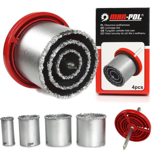 Zestaw zawiera uchwyt i wiertło prowadzące. Nasyp wolframu ułatwia wiercenie w różnego rodzaju materiałach budowlanych, w tym w płytkach ceramicznych.