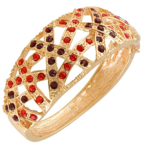 Sztywna bransoletka, zapinana na boku o obwodzie 17 cm. Barwa złota, wysadzana brązowymi i czerwonymi dżetami. Owalny kształt, pasujący do naturalnego kształtu ręki. Tylnia połowa nie jest wysadzana kamieniami. Pięknie ozdobi nadgarstek podczas spotkań towarzyskich, ale także pasować będzie na co dzień i do pracy.