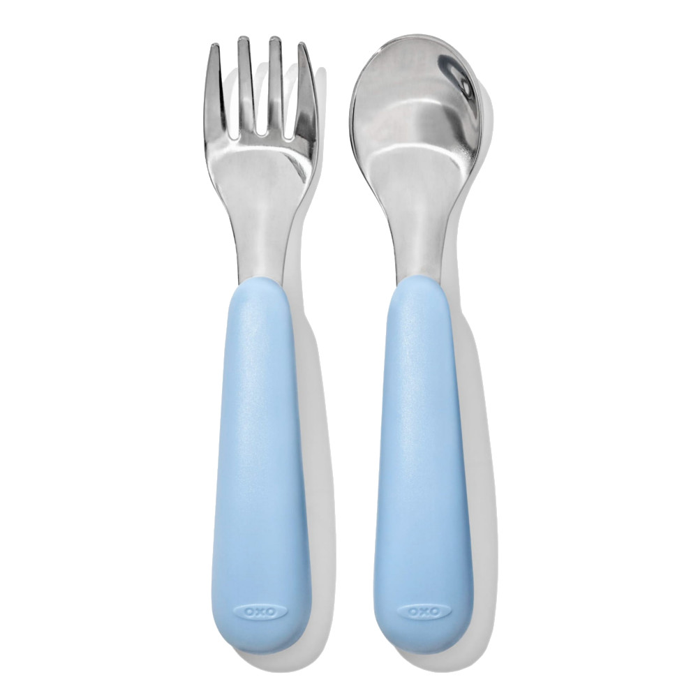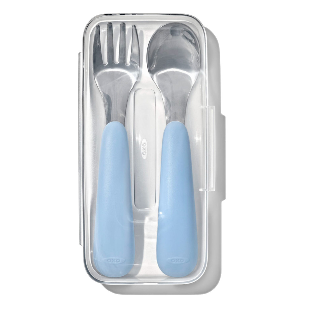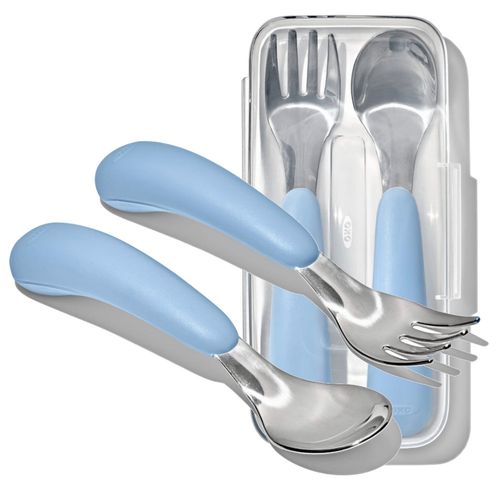 Sztućce metalowe w etui marki OXO tot to zestaw stworzony do nauki samodzielnego jedzenia dla dzieci od 12 miesiąca życia. Składa się on z łyżki i widelca zamkniętych w wygodnej kasetce. Ten praktyczny, wygodny i higieniczny komplet doskonale sprawdzi się podczas rozszerzania diety niemowlaka. Możesz używać go i w domu, i w podróży.