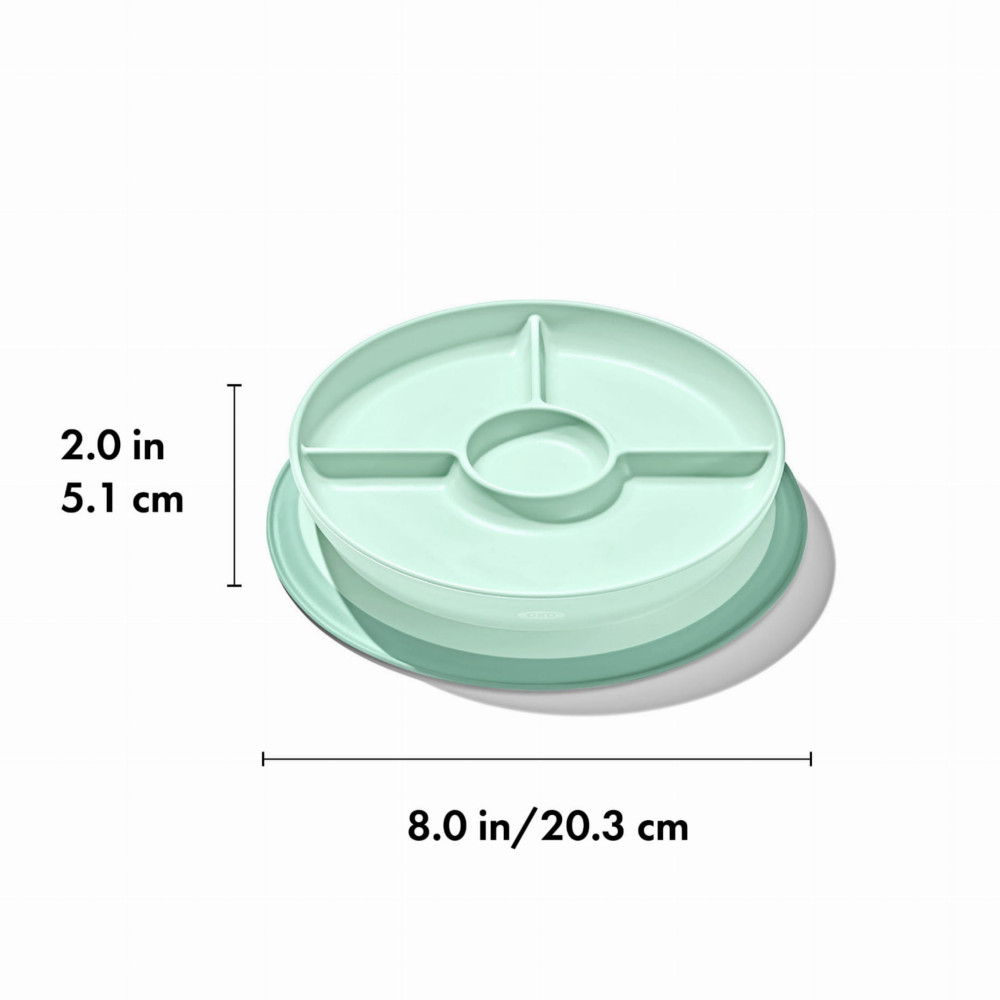 Talerzyk dzielony z przyssawką OXO tot jest super-wygodnym i bardzo praktycznym rozwiązaniem dla rodziców, którzy właśnie wprowadzają do diety niemowlaka pierwsze stałe posiłki. Szczególnie zaś tych, którzy decydując się na rozszerzanie diety dziecka, wybierają metodę BLW. Trzy przegródki talerzyka pozwalają na podanie maluchowi trzech różnych rodzajów pożywienia. Dodatkowo przyssawka chroni talerzyk przed wywróceniem, a stół i odzież dziecka przed pobrudzeniem, ułatwiając maluszkowi naukę jedzenia we wczesnych etapach rozszerzania diety niemowlaka. Przyjazny sposób montażu i demontażu naczynia sprawia, że rodzic łatwo go przyczepi i odczepi, ale dla dziecka odklejenie mocnej przyssawki będzie stanowiło dużą trudność. Ścianki talerzyka dzielonego OXO tot są zaokrąglone, aby ułatwić maluchowi nabieranie posiłku na łyżkę, a rodzicom - umycie naczynia. Chcąc dotrzeć podczas mycia do trudniej dostępnych miejsc, przyssawkę odkręcamy, a każdą część talerzyka myjemy i suszymy osobno. Klasyczny, prosty design talerzyka dzielonego z przyssawką OXO tot, pozbawiony dekoracji, eliminuje bodźce, które rozpraszają dziecko przy posiłku. Uczący się samodzielnie jeść maluch skupia się na tym, co najważniejsze, czyli na jedzeniu. Talerzyk dzielony z przyssawką to praktyczne i higieniczne rozwiązanie, które kochają nasi mali i duzi klienci.