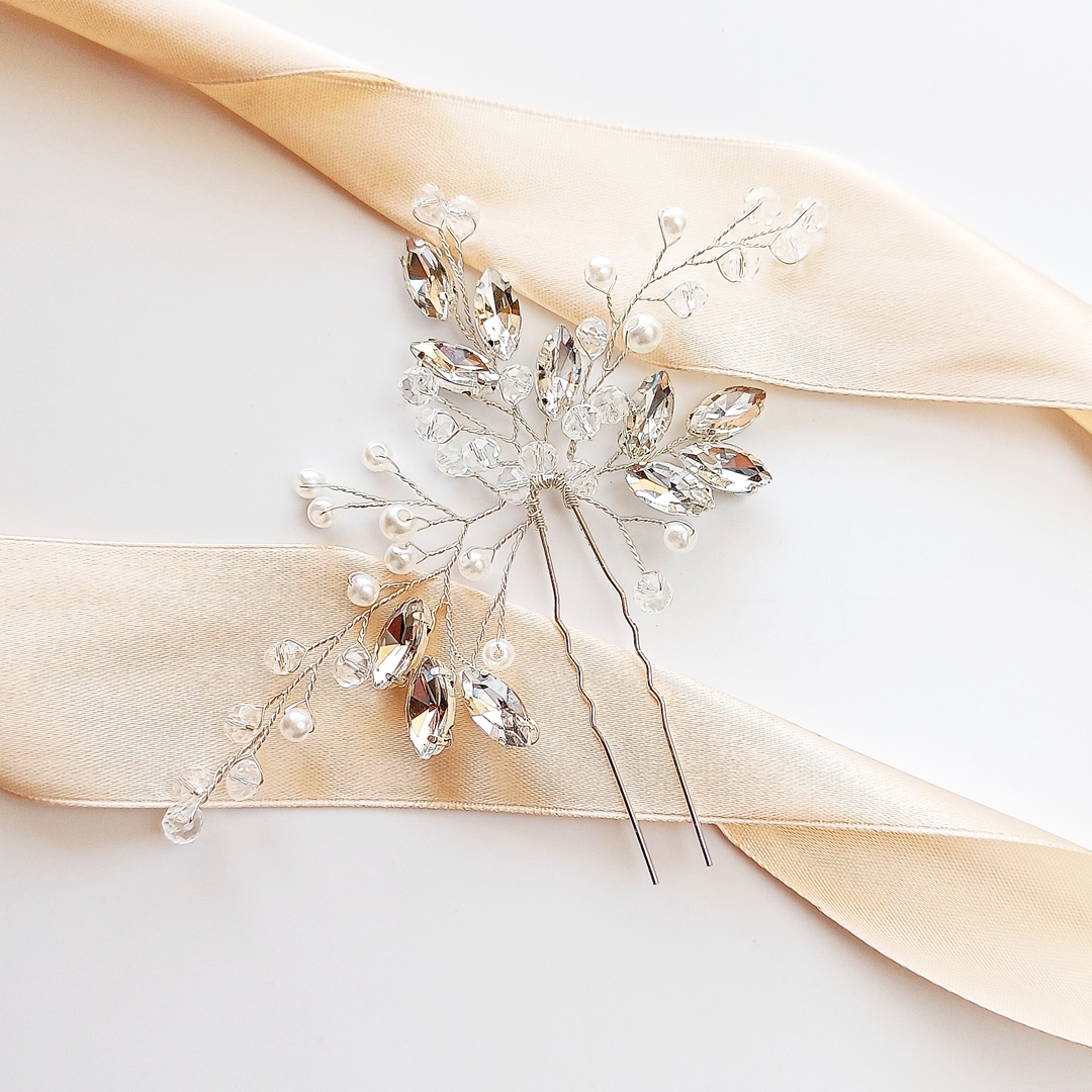 Ta ozdoba ślubna do włosów w postaci kokówki z koralikami, cyrkoniami i perełkami zaakcentuje obecność biżuteryjnych dodatków we włosach ubierając je w blask. Ozdoba jest nienachalna i z łatwością wepniesz ją w dniu ślubu zarówno do koka, jak i lekko podpiętych kosmyków.
