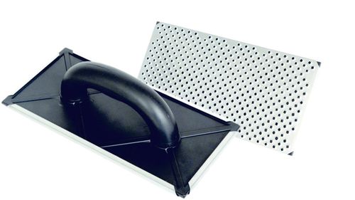 Paca z tworzywa sztucznego z ergonomicznie wyprofilowanym uchwytem Blat roboczy z blachy ocynkowanej z otworami Do wyrównywania łączeń płyt styropianowych podczas prac dociepleniowych