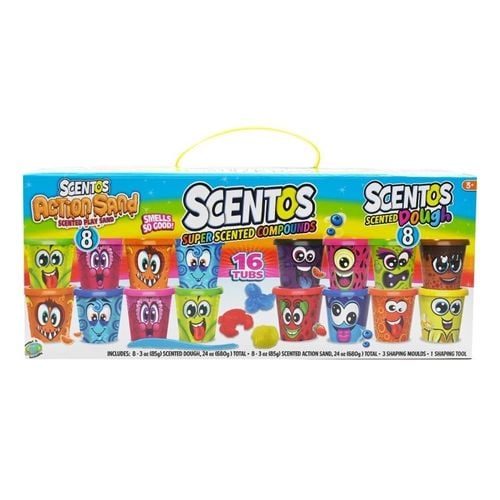 – zestaw zawiera: 8 kubeczków z zapachowym piaskiem kinetycznym w różnych kolorach, 8 kubeczków z zapachową ciastoliną w różnych kolorach, 3 foremki i 1 narzędzie do formowania;