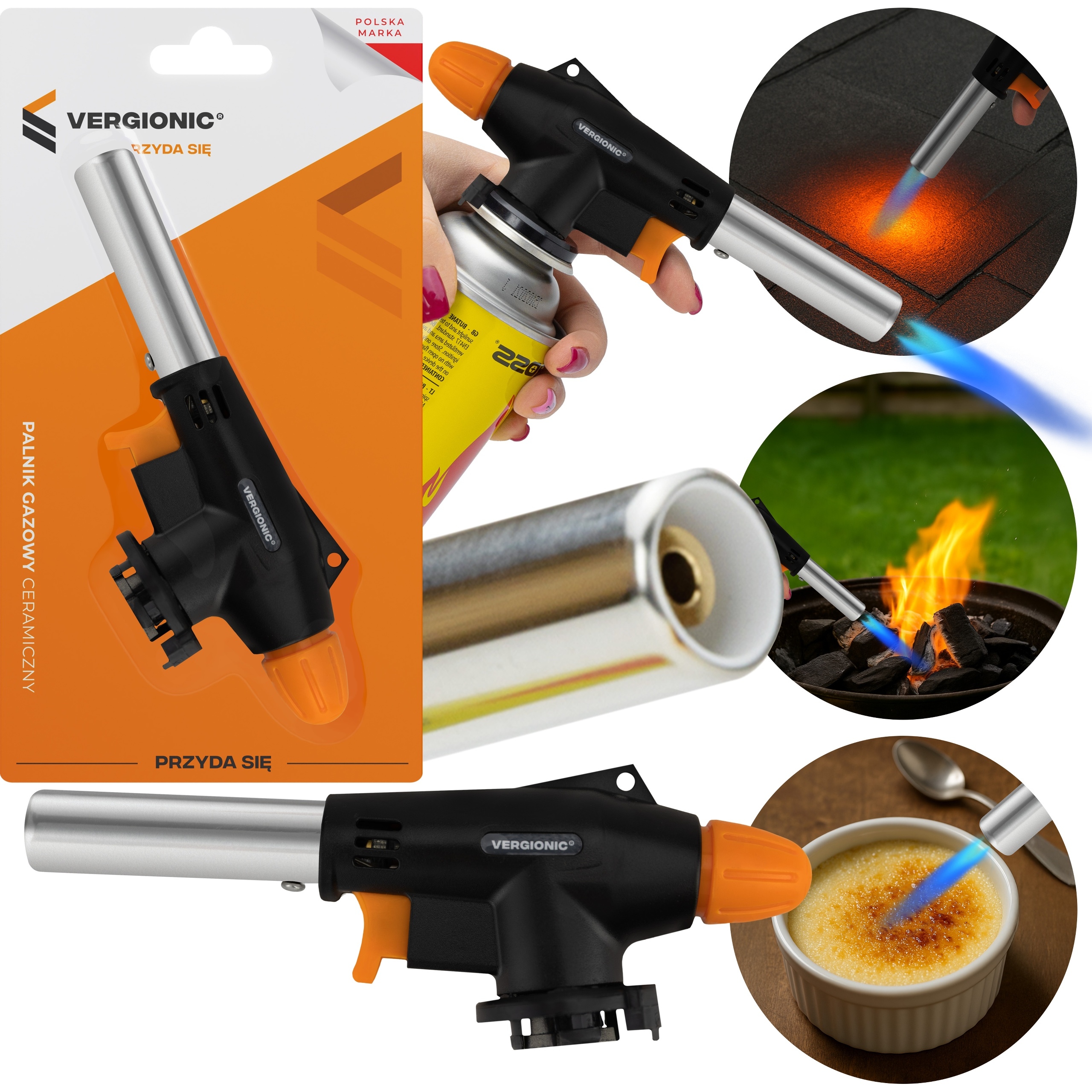 Palnik gazowy VERGIONIC to wszechstronne narzędzie z automatycznym zapłonem piezoelektrycznym, umożliwiające szybkie uruchomienie bez użycia zapałek. Wyposażony w płynną regulację płomienia, pozwala dopasować temperaturę do różnych zastosowań – od kulinarnych po warsztatowe. Solidna obudowa z ABS, metalu i ceramiki zapewnia odporność na uszkodzenia, temperaturę oraz wilgoć, co gwarantuje długą żywotność.