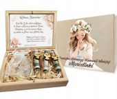 To pudełeczko to nie tylko piękny prezent, ale również praktyczny dodatek. Dolna część wypełniona wełną drzewną pozwala na umieszczenie w nim pieniędzy lub innych drobnych upominków, czyniąc go idealnym rozwiązaniem na tę wyjątkową okazję.