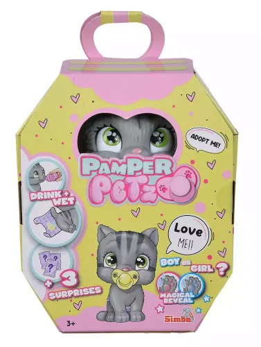 „Pamper Petz” to seria uroczych zwierzątek szukających właściciela, który je zaadoptuje, nada im imię i czule się nimi zaopiekuje. Uroczy gang pieluchowy składa się ze szczeniaka, kotka i króliczka. Słodki kotek z dużymi, błyszczącymi oczami potrafi pić i sikać. Ma pieluchę, która zmienia kolor na żółty, gdy jest mokra. Zobacz na łapkę kotka, a dowiesz się, czy jest chłopcem czy dziewczynką. W zestawie znajdują się również akcesoria do karmienia i pielęgnacji kociaka, a także specjalny certyfikat adopcyjny.