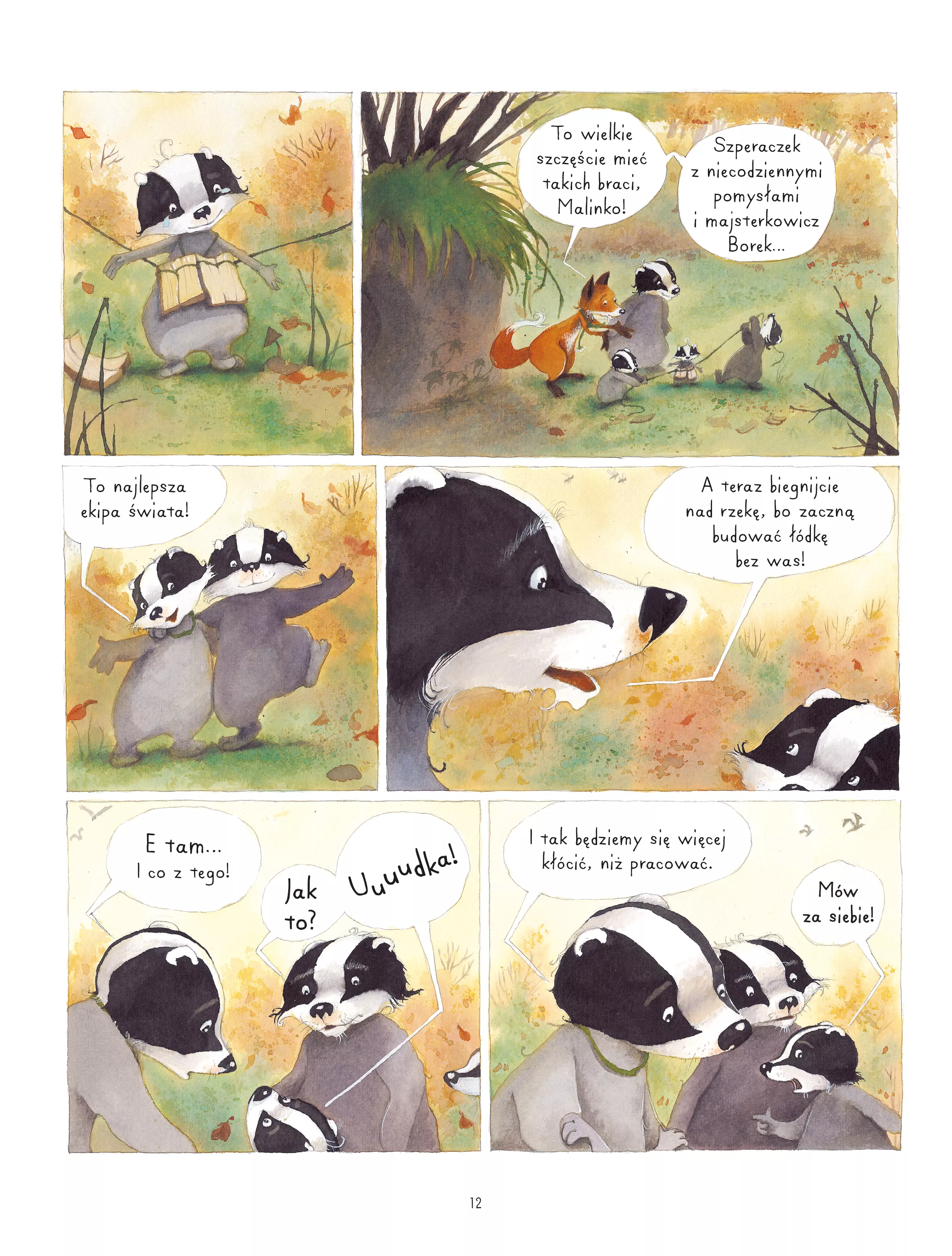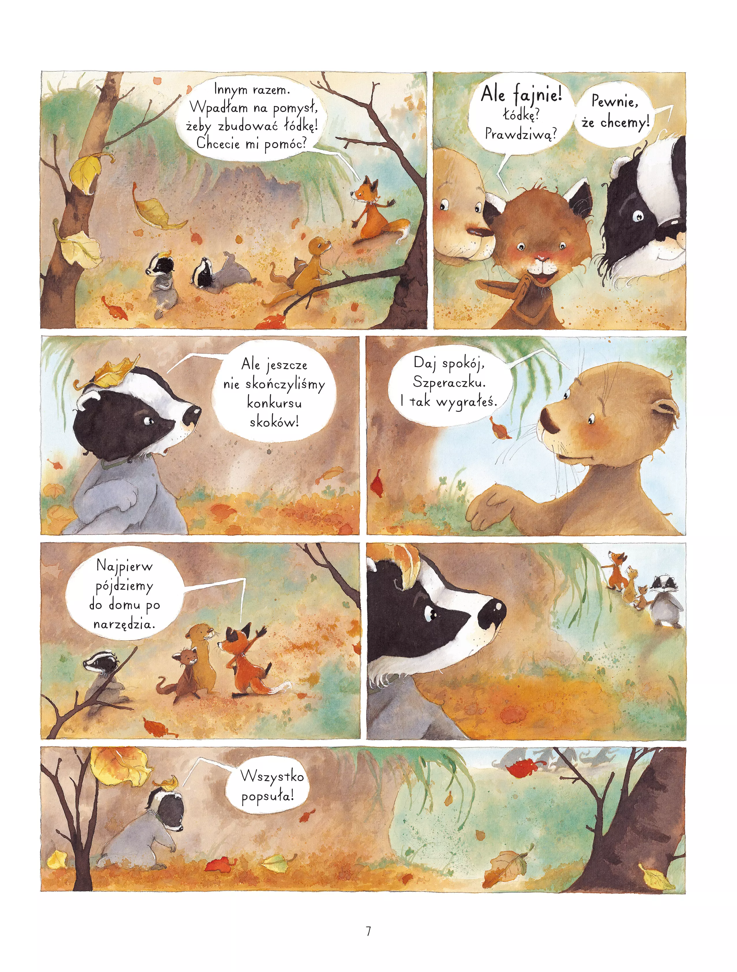 Nadeszła jesień. Róża, Szperaczek i Borek postanowili zorganizować regaty na rzece. Ale muszą najpierw zbudować łódkę, co nie jest tak trudne, jak dogadanie się, jak ta łódka ma wyglądać. Czy uda im się w końcu wziąć udział w przygodzie żeglarskiej? Ludzkie charaktery w zwierzęcych maskach, zabawne perypetie i próba zmierzenia się z innością, która zamiast dzielić, łączy naszych sympatycznych bohaterów. Według dziennika „Le Monde” historia pana Borsuka i pani Lisicy to „przepełniona humorem i czułością piękna lekcja tolerancji”.