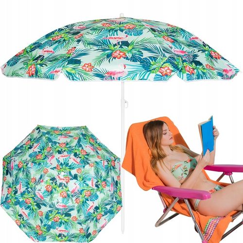Czasza wykonana z wysokiej jakości poliestru 170g/m² skutecznie blokuje szkodliwe promienie UV, zapewniając komfortowy cień. Motyw flamingów i tropikalnych liści dodaje uroku i wakacyjnego nastroju.