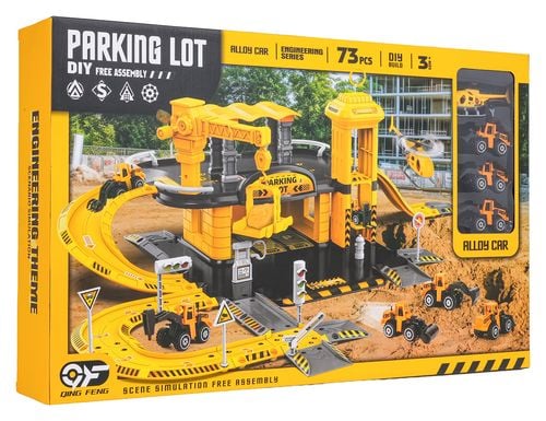 | Zestaw parking z placem budowy i autkami budowlanymi dla dzieci od trzeciego roku życia. Wszystkie elementy zestawu wykonane zostały z najlepszej jakości materiałów bezpiecznych dla dzieci. Parking będzie gratką dla miłośników robót budowlanych. Konstrukcja parkingu jest dwupoziomowa. Na parterze znajduje się stacja benzynowa, droga oraz winda wioząca pojazd na pierwsze piętro (manualnie), gdzie umiejscowiono plac budowy z ruchomym dźwigiem. Z góry pojazdy mogą zjechać windą lub zjeżdżalnią. W zestawie mamy 3 metalowe pojazdy budowlane i helikopter. Zestaw po złożeniu nie zajmuje dużo miejsca, a daje wiele możliwości zabawy.