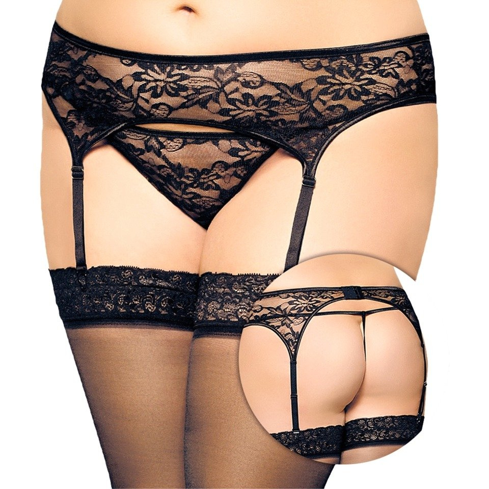 W komplecie stringi, z przodu wykonane z siateczki i kwiecistej koronki.